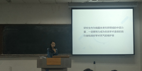 会上,卫萍指出学术规范、学风建设在研究生阶段的重要性。并通过近期学术不端行为的案例指出学术诚信的重要性,强调研究生学风建设与学术规范的养成,并为研究生学术规范学习提供自身方法。此外就本次宣讲会意义与具体流程做了介绍。