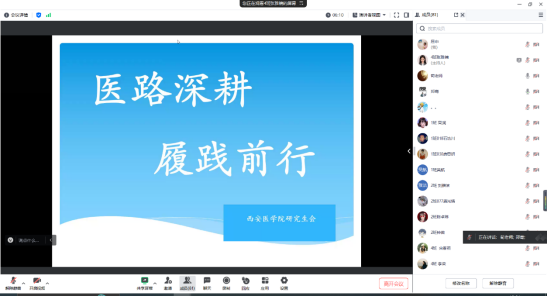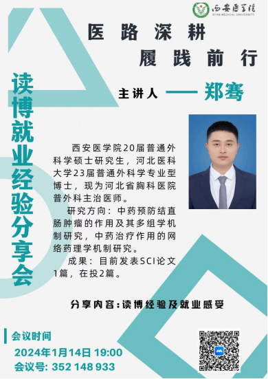 为全面贯彻党的二十大精神,深入推进新时代青年人才工作,发挥校友传帮带作用,指导学生做好研究生生涯规划。为了充分发挥党建工作引领业务工作的发展的作用,根据研究生党总支的工作部署,2024年1月14日,由研工部主办、校研究生会承办的第三期研究生校友朋辈沙龙成功举办。本次分享会的主题是“医路深耕,履践前行——读博就业经验分享”。本次讲座邀请我校2020届外科学硕士研究生、2023届河北医科大学博士研究生郑骞主讲,研究生工作科科长曹卓琳、就业专干荀丹丹、辅导员吕欣及100余名研究生参加了本次线上分享会,讲座由研究生会科研部干事张雅楠主持。