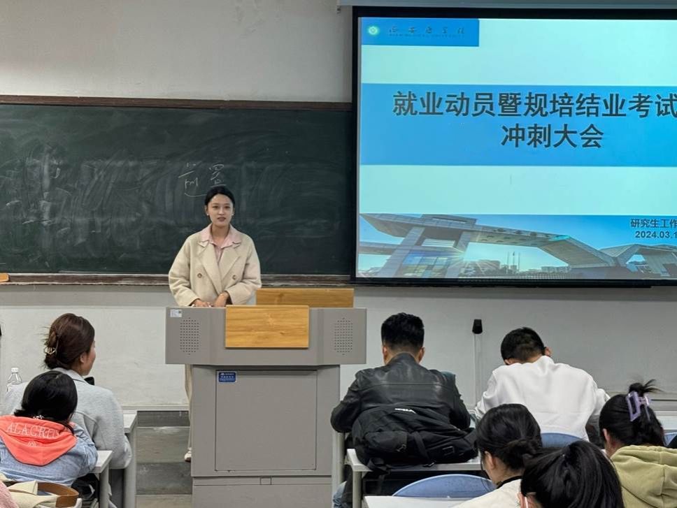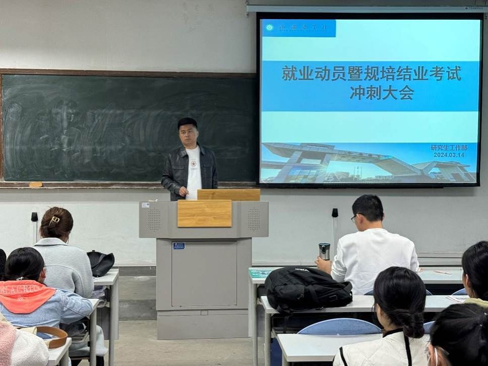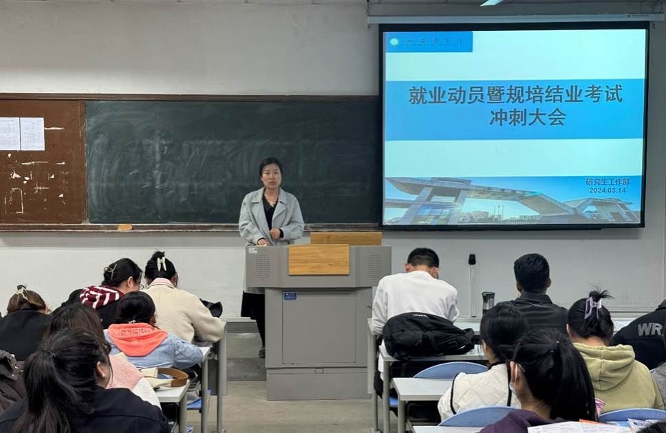 为全面贯彻落实党中央、国务院对高校毕业生就业创业工作的决策部署,结合我校就业工作要求和校领导讲话精神,持续推进我校2024级研究生就业工作。3月14日晚,研究生工作部结合本届毕业研究生实际就业和住院医师规范化培训(规培)模拟考试情况,在含光校区召开了“就业动员暨规培结业考试冲刺大会”,研究生工作部部长张光伟、研究生工作科科长曹卓琳、就业专干荀丹丹及全体2024届毕业研究生参加会议,会议由毕业班辅导员付丹丹主持。