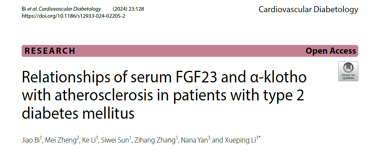 文章链接:Bi J, Zheng M, Li K, Sun S, Zhang Z, Yan N, Li X. Relationships of serum FGF23 and α-klotho with atherosclerosis in patients with type 2 diabetes mellitus. 2024, 15, 23(128): 1-12 . https://doi.org/10.1186/s12933-024-02205-2