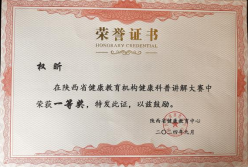 2024年9月12日至13日,由陕西省卫生健康委和陕西省健康教育中心联合主办的全省健康教育机构健康科普讲解大赛在西安隆重举行。在本次大赛中全省共55位科普创作者入围总决赛。我院研工部22级全科医学专业硕士研究生权昕成功进入决赛阶段,并在决赛过程中表现优异,荣获一等奖。
