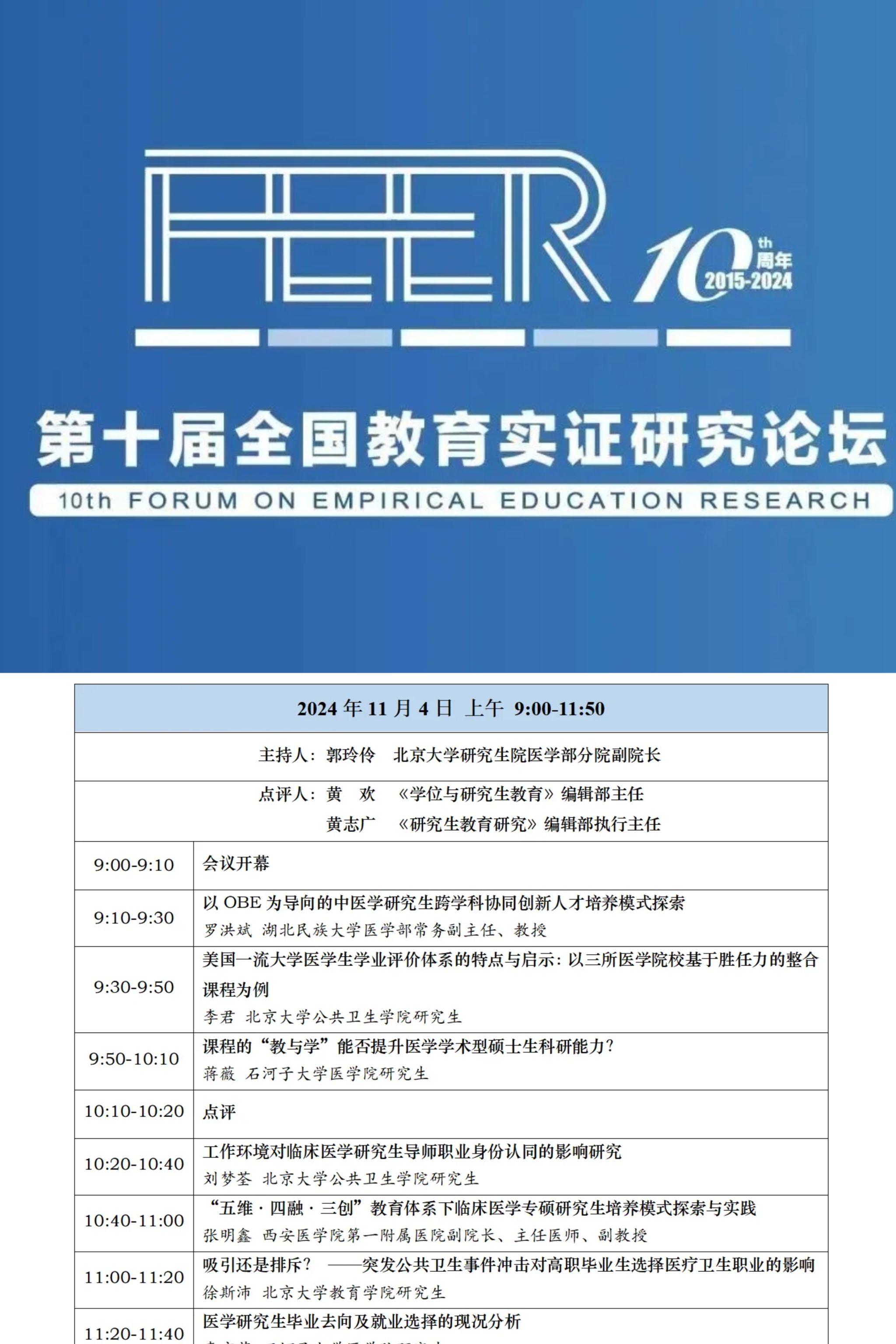 11月4日,由北京大学研究生院医学部分院组织、北京大学医学学位与研究生教育研究中心作为学术支持单位的第十届全国教育实证研究论坛之“基于理论、方法与证据的医学研究生教育改革与发展”主题分论坛以线上直播的方式成功举办。我校研究生处组织相关工作人员参加线上会议,同时硕士研究生导师张明鑫受邀进行报告交流。与各大高校的专家学者和在读研究生共同交流,探讨当前时代背景下医学研究生教育该何去何从。