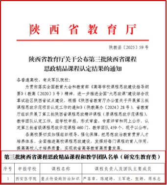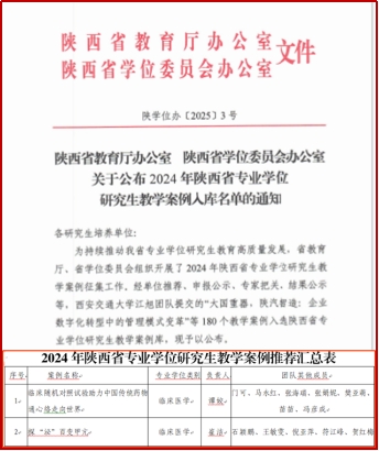 日前,陕西省教育厅、陕西省学位委员会公布第三批陕西省课程思政精品课程及教学团队的认定结果和2024年陕西省专业学位研究生教学案例入库名单。我校“重点传染病防治知识”研究生课程思政教学团队成功入选“陕西省课程思政精品课程和教学团队”,《临床随机对照试验助力中国传统药物通心络走向世界》《探“泌”百变甲亢》获评陕西省专业学位研究生教学案例。多项成果获批充分彰显了我校在研究生教育教学中深化思政育人、推进“三全育人”改革的显著成效。