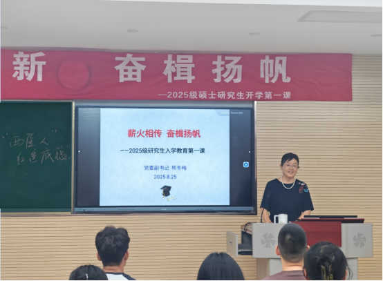 根据学校暑期工作安排,研究生党总支精心策划、认真筹备新学期研究生入学教育工作。8月25日,党委副书记熊冬梅在含光校区以“薪火相传奋楫扬帆”为题,为我校 2025级临床医学硕士新生讲授开学第一课。研究生党总支书记、研究生工作部部长张光伟主持。