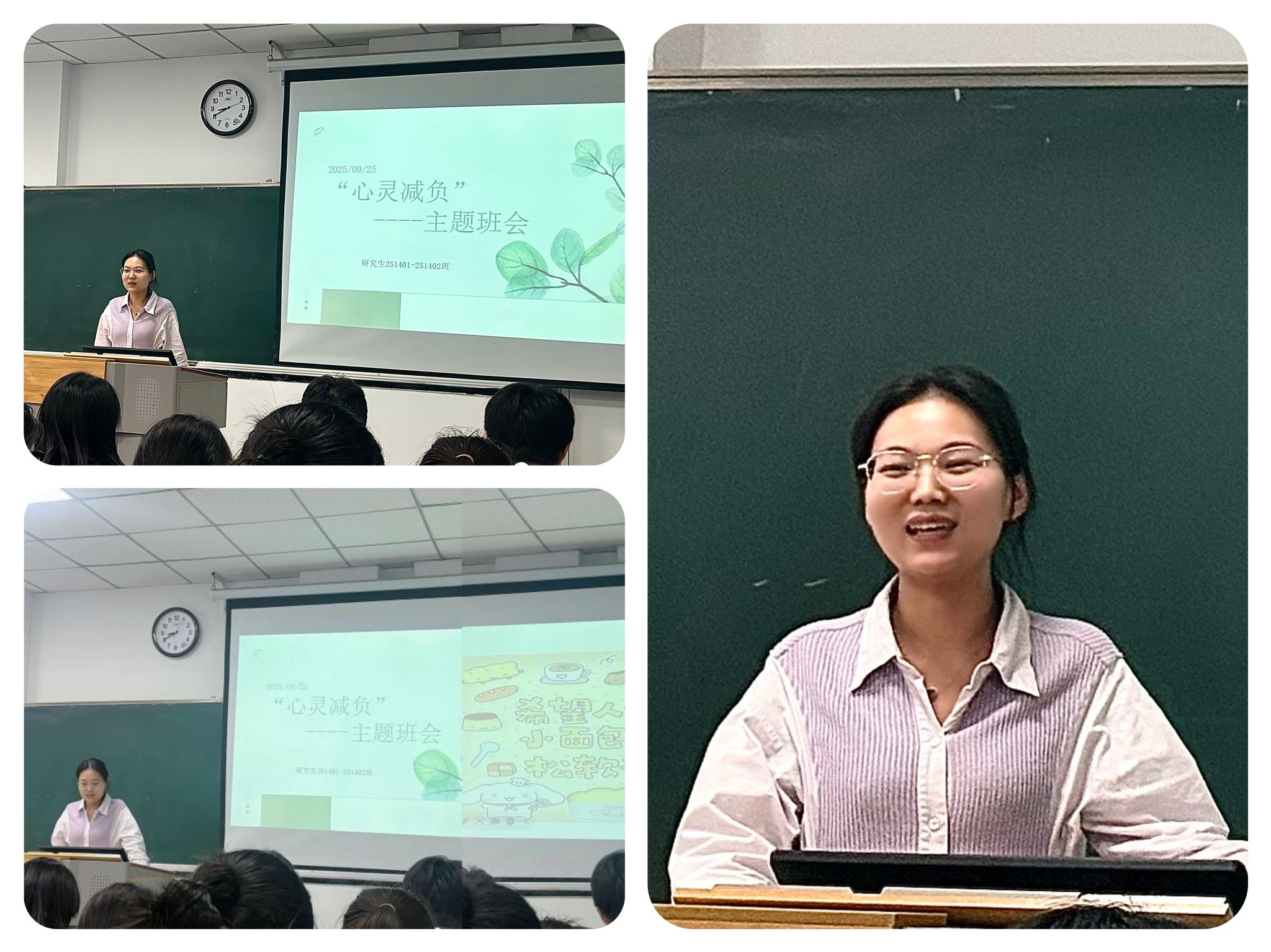 在主题班会最后,班长龚雪聚焦研究生群体的特定心理需求,带来了一场精彩的“心灵减负”分享。她从心理健康的重要性切入,结合实例阐述了其对学业生活的深远影响;进而精准剖析了研究生在科研写作、人际交往等方面面临的心理困扰根源,帮助同学们认清自身压力来源;最后,她给出了“规律作息、运动解压、主动倾诉”等一系列具体可行的行动指南,为同学们科学缓解压力、提升心理调适能力提供了有效支持。
