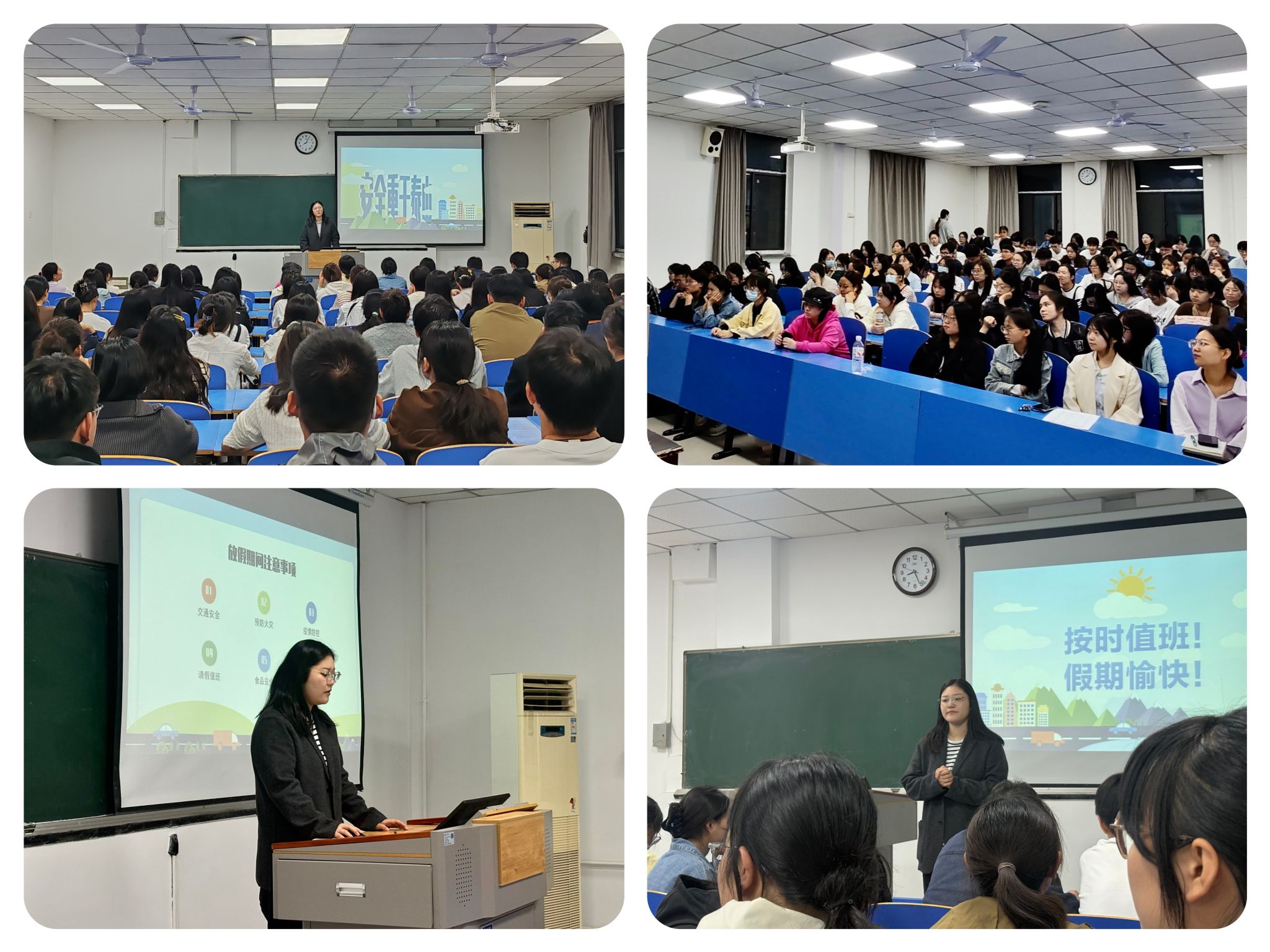 首先辅导员袁安妮围绕国庆长假假期安全核心,从六个关键方面展开,提醒大家注意安全:返乡出游请遵守交通规则,避免疲劳驾驶;留校或居家需规范用火用电,熟悉消防通道;关注流感防控政策,注意个人卫生、减少聚集;离校请按规定请假,值班人员要尽责守岗;注意饮食安全,选择正规餐饮、尽量堂食;同时请掌握日常防护技巧,提升自我防范意识,愿大家平安度过假期。