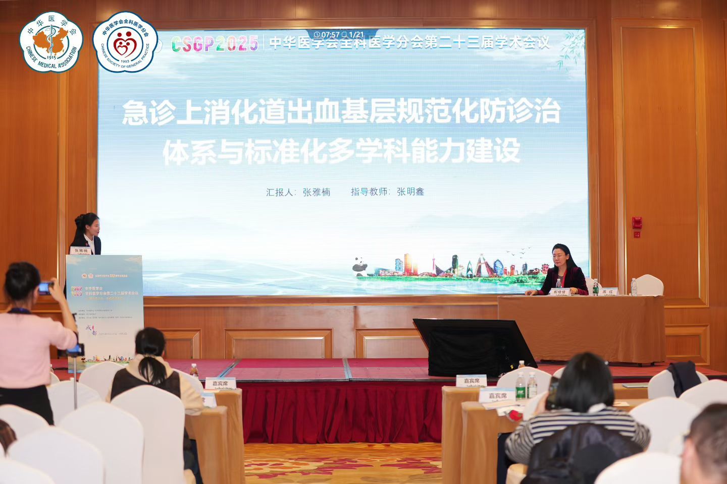 来自我校第一附属医院2023级临床医学专硕研究生张雅楠在基层卫生与健康分论坛作了题为《急性上消化道出血基层规范化防诊治体系与标准化多学科能力建设》的主旨报告。报告围绕如何实现基层与三级医院诊疗同质化、加强各级医疗机构及学科协作、优化患者诊疗流程等关键问题,结合《中国县域医共体急诊急救大平台建设规范专家共识》,提出了构建以县域医共体为基础的规范化防诊治体系,推动形成“院前分级转诊—院内多学科救治—院外规范随访”的全流程管理模式。专家在点评中充分肯定了该研究的实践价值,并对我校研究生教育培养工作给予了高度评价。