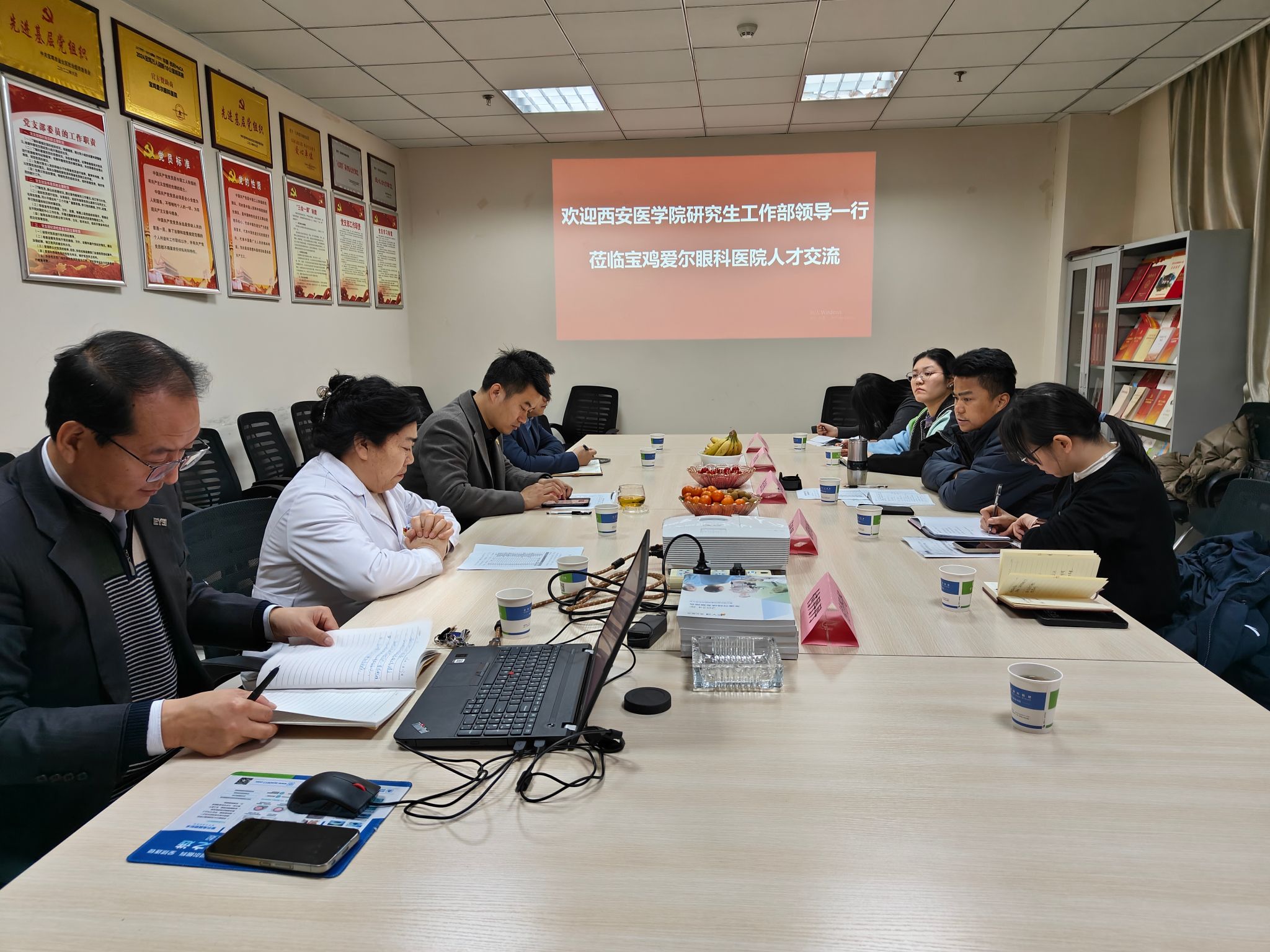 为深入贯彻落实陕西省教育厅办公室《关于开展“优企引才”定向访企拓岗促就业专项行动的通知》精神,精准对接行业人才需求,搭建校企协同育人与研究生就业合作桥梁,1月19日,西安医学院研究生工作部部长张光伟带领就业专干及辅导员一行,前往宝鸡爱尔眼科有限责任公司开展专项交流活动,聚焦眼科专业研究生就业发展与校企深度合作展开洽谈。宝鸡爱尔眼科医院CEO王良、院办主任杨宁、人力资源部主任文勇、医务部主任袁雨萍出席交流活动。