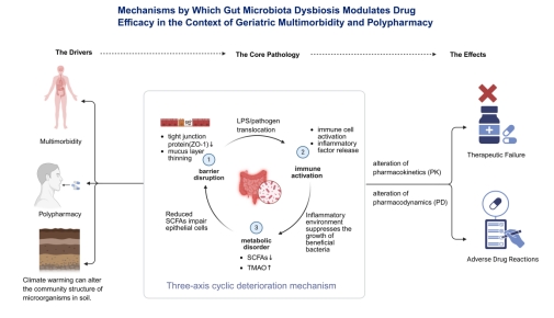 随着全球老龄化进程加速,老年多病共存(即同时患有两种及以上慢性病)现象日益普遍,多重用药带来的药物疗效与安全性问题日趋突出。该文章系统阐述了肠道菌群在老年共病患者药物代谢、免疫调节与肠屏障功能中的核心作用,提出“代谢-免疫-屏障轴”协同失调的理论框架(图1),并深入剖析了其对常用药物(如氯吡格雷、地高辛、二甲双胍等)疗效的影响机制,进一步总结并评估了益生菌、益生元、菌群移植、噬菌体疗法及膳食干预等微生态调控策略的临床应用现状与局限,提出了未来基于人工智能、多组学技术与合成生物学手段的个体化干预方向,为老年共病患者的精准用药与健康管理提供了新思路。