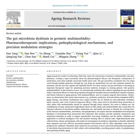 近期,我校2024级临床医学专硕研究生杨朵以第一作者在国际老年医学领域顶级期刊《Ageing Research Reviews》(中科院一区,IF:12.4)上发表了题为《The gut microbiota dysbiosis in geriatric multimorbidity: Pharmacotherapeutic implications, pathophysiological mechanisms, and precision modulation strategies》的综述论文。西安医学院第一附属医院张明鑫教授、孙超教授、崔曼莉教授为该论文通讯作者。该成果标志着我校在研究生培养领域取得重要进展。