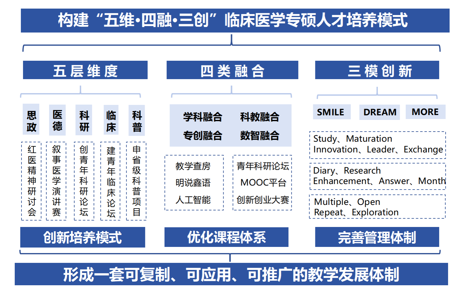 本次全省教学成果奖评选共产生347项获奖成果,其中特等奖62项、一等奖94项、二等奖191项。该获奖项目聚焦高素质复合型临床医学专硕研究生培养,系统构建并实践了具有西医特色的“五维·四融·三创”培养模式。成果围绕临床医学专硕研究生岗位胜任力要求,在优化课程体系、强化实践教学、深化医教协同等方面进行了系统探索,着力提升研究生的临床思辨能力、科研创新能力和职业综合素养,为培养适应新时代需求的复合型临床医学人才提供了有益经验和可推广的范式。