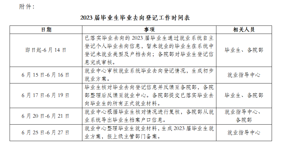 根据《国务院办公厅关于进一步做好高校毕业生等青年就业创业工作的通知》(国办发〔2022〕13 号)、《中共中央组织部 人力资源社会保障部 教育部 公安部 国务院国资委 关于做好取消普通高等学校毕业生就业报到证有关衔接工作的通知》(人社部发〔2023〕26 号)等相关文件要求,为切实落实去向登记制度,做好我校 2023 届毕业生去向登记工作,现就有关事项通知如下: