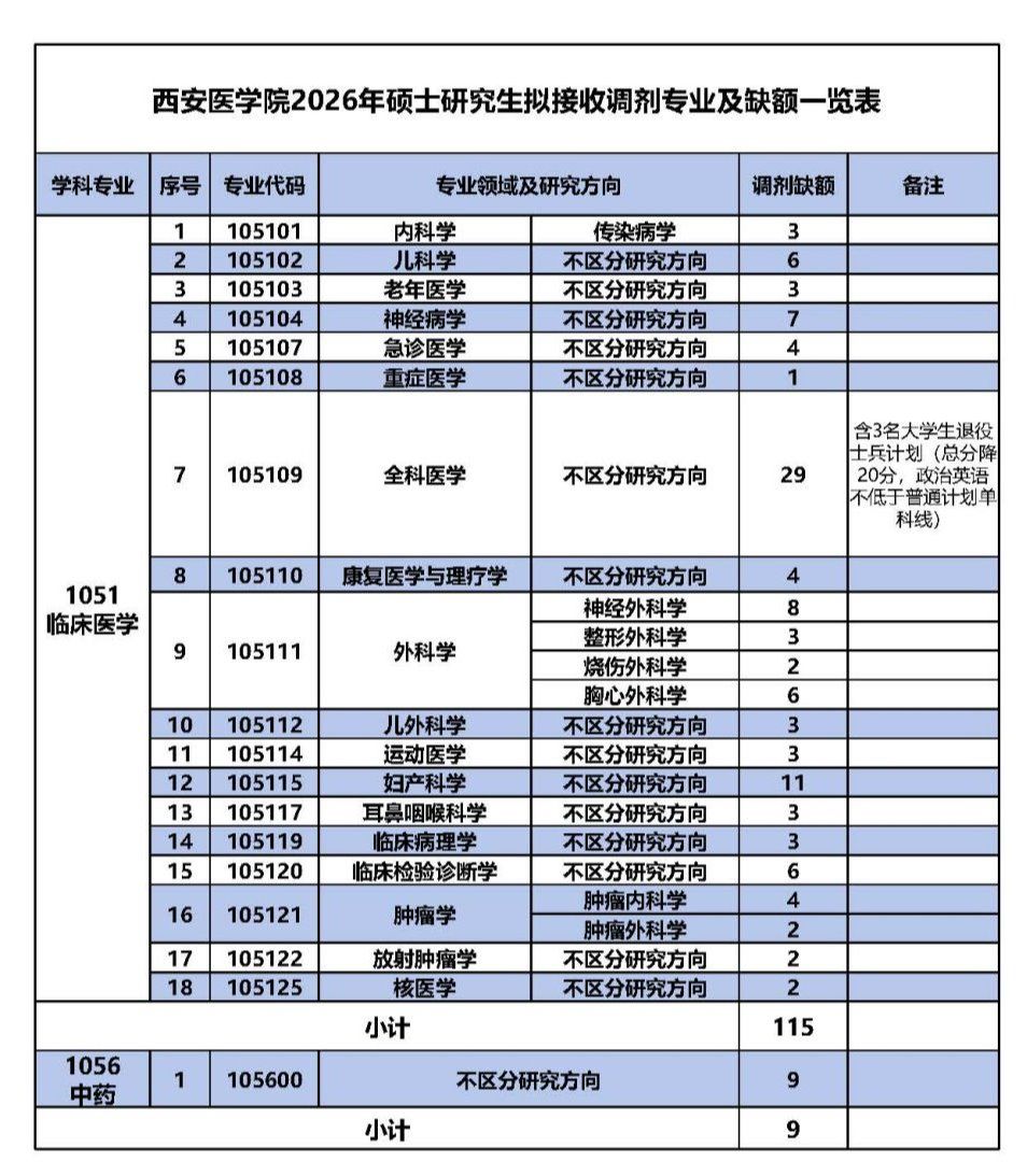 为做好我校2026年硕士研究生招生调剂工作,根据教育部《2026年全国硕士研究生招生工作管理规定》(教学函〔2025〕2号)和陕西省教育考试院陕西省招生委员会办公室《关于做好2026年全国硕士研究生复试录取工作的通知》(陕试研〔2026〕1号)相关工作要求,结合我校2026年招生计划和一志愿拟录取情况,现将我校硕士研究生拟调剂专业、缺额和调剂系统开放时间公布如下: