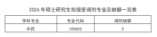 根据我校2026年硕士研究生招生情况,现拟开通调剂服务系统,调剂系统开放时间为2026年4月12日08:00,具体可接受调剂专业及人数见下表。