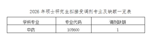 根据我校2026年硕士研究生招生情况,现拟开通调剂服务系统,调剂系统开放时间为2026年4月15日08:00,具体可接受调剂专业及人数见下表。
